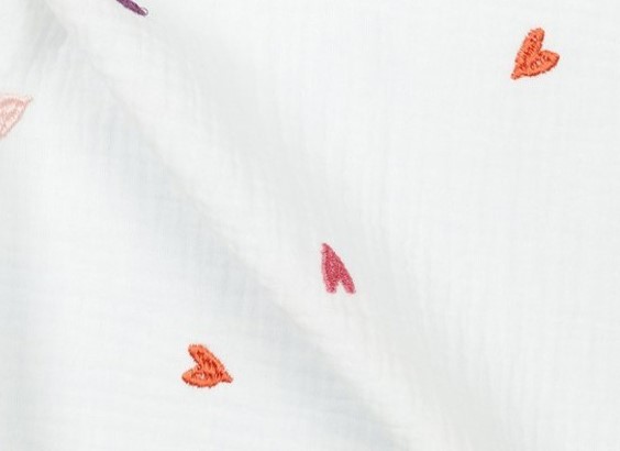 Wunderschöner Musselin Double Gauze weiß mit Herzen in rosa, hellrosa, orange und lila bestickt.