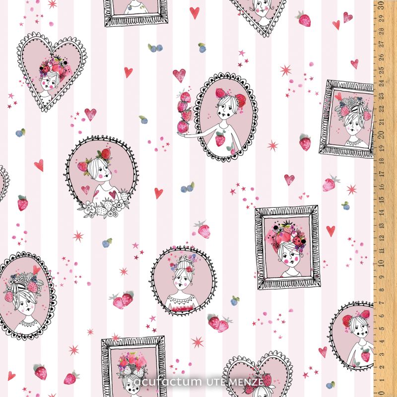 Auf roséweiß gestreiftem Grund entfaltet sich eine romantische Bildwelt aus feinen Damenportraits. Zarte Rosétöne, kleine Herzen und funkelnde Sterne verleihen dem Design eine feminine Leichtigkeit, die an verträumte Illustrationen und liebevoll geführte Skizzenbücher erinnert. Der verspielte Mix aus feiner Lineart und sanften Aquarellnuancen schenkt dem Stoff eine lebendige, künstlerische Ausstrahlung.