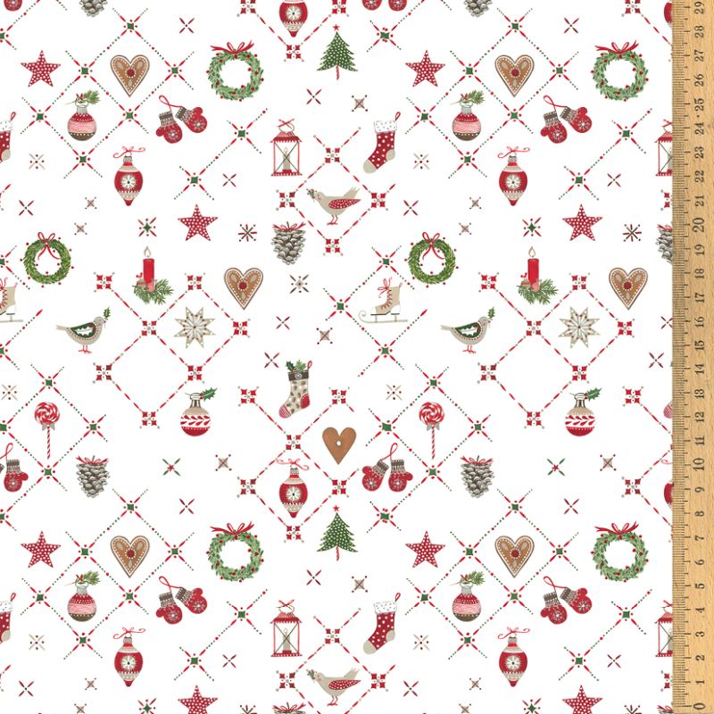 Der Baumwollstoff Weihnachtsornamente ist eine liebevolle Zusammenstellung klassischer Weihnachtssymbole, die an vertraute Rituale und festliche Kindheitserinnerungen erinnert. Gestaltet mit den detailreichen Illustrationen von Kerstin Heß und als Teil der Engelswerk-Kollektion, zeigt dieser Stoff ein harmonisches Mosaik aus liebevoll platzierten Motiven auf hellem Grund. Christbaumkugeln, Herzen, Kränze, Zapfen, Lebkuchen, kleine Vögel, Strümpfe und Kerzen wechseln sich in regelmäßigen Abständen ab und sind durch feine, rot-grüne Linien zart miteinander verbunden. Wie auf einem gestickten Gitter angeordnet, wirken die Elemente fast wie kleine Stickereien auf einem Leinenhintergrund. Die Farben in warmem Rot, Tannengrün und sanften Naturtönen unterstreichen den traditionellen Charakter dieses Designs und schaffen eine ruhige, nostalgische Weihnachtsstimmung Weihnachtsornamente eignet sich wunderbar für Patchworkarbeiten, Adventskalender, festliche Tischdecken oder liebevoll gestaltete Nähprojekte, die das Herz erwärmen und das Zuhause schmücken. Farbig bedruckter Baumwollstoff, Motive: Kerstin Heß, Rapportdesign: acufactum